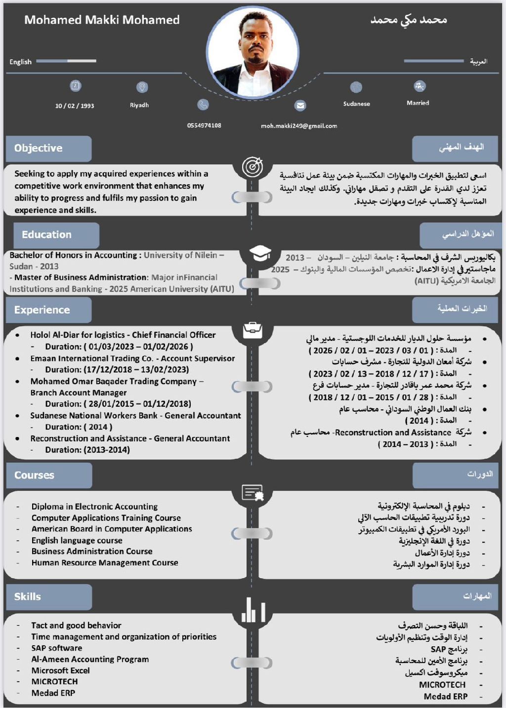 مدير حسابات واداري سوداني الجنسية خبرة 10 سنوات داخل المملكة في اعداد وادارة وتنظيم الحسابات واعداد القوائم والتقارير المالية والضرائب وتقديم الاقرارات الضريبية والتعامل مع البرامج المحاسبية وخبرة ومهارات ادارية وتنظيمية وقدرات تحليلية ومهارات المتابعة والاشراف علي القسم المالي خبرة في الشوؤن الادارية وعمل HR مكان الإقامة الرياض