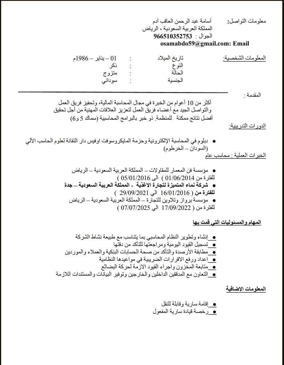محاسب سوداني خبرة (11 سنة بالمملكة العربية السعودية) مقيم في الرياض. محترف بنظام SMACC 6 Cloud وإدارة الدورة المحاسبية كاملة تأسيس الأنظمة، تسجيل القيود بدقة ومطابقتها مستنديآ. رقابة يومية صارمة على إقفالات الكاش والشبكة للفروع، ومطابقة حسابات العملاء والموردين شهريا. اعداد ورفع الاقرارات الضريبية (VAT) والتنسيق مع المراجع الخارجي لاصدار القوائم المالية السنوية