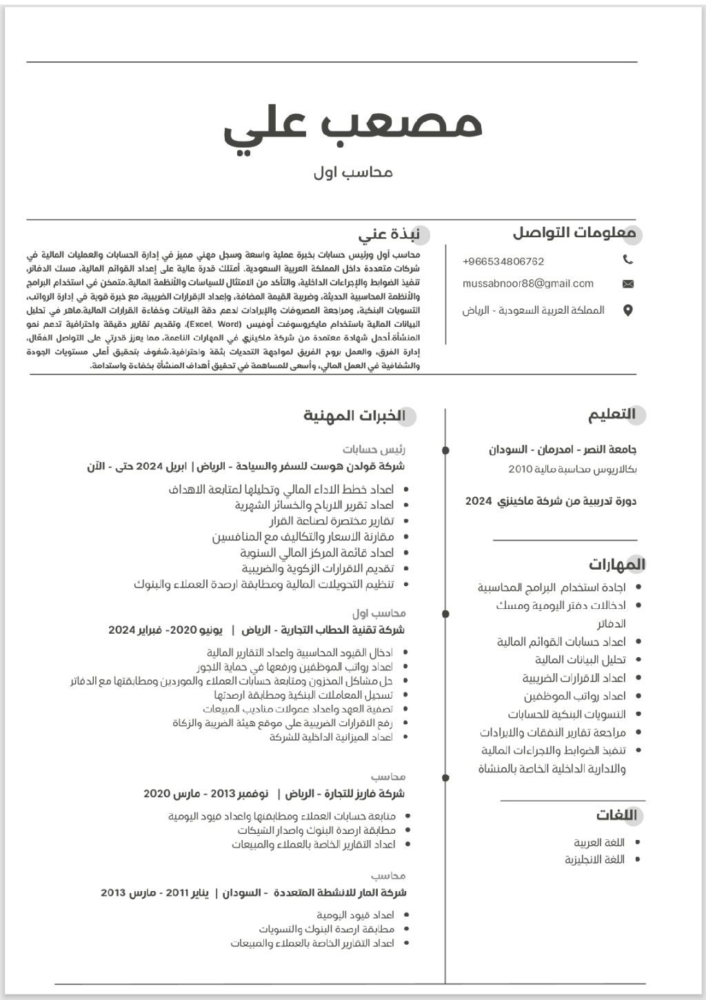 محاسب سوداني بخبرة 12 سنة ابحث عن عمل في الرياض متخصص في تأسيس الأنظمة المحاسبية واعداد شجرة الحسابات، ومسك الدفاتر واعداد القوائم المالية والتقارير المالية، عمل القيود اليومية ومطابقة حسابات العملاء وكشوفات البنوك، اعداد الرواتب ورفعها على حماية الأجور، رفع الاقرارات الضريبية والزكوية، والتحليل المالي لخفض التكاليف وزيادة الايرادات والعمل على مختلف البرامج المحاسبية