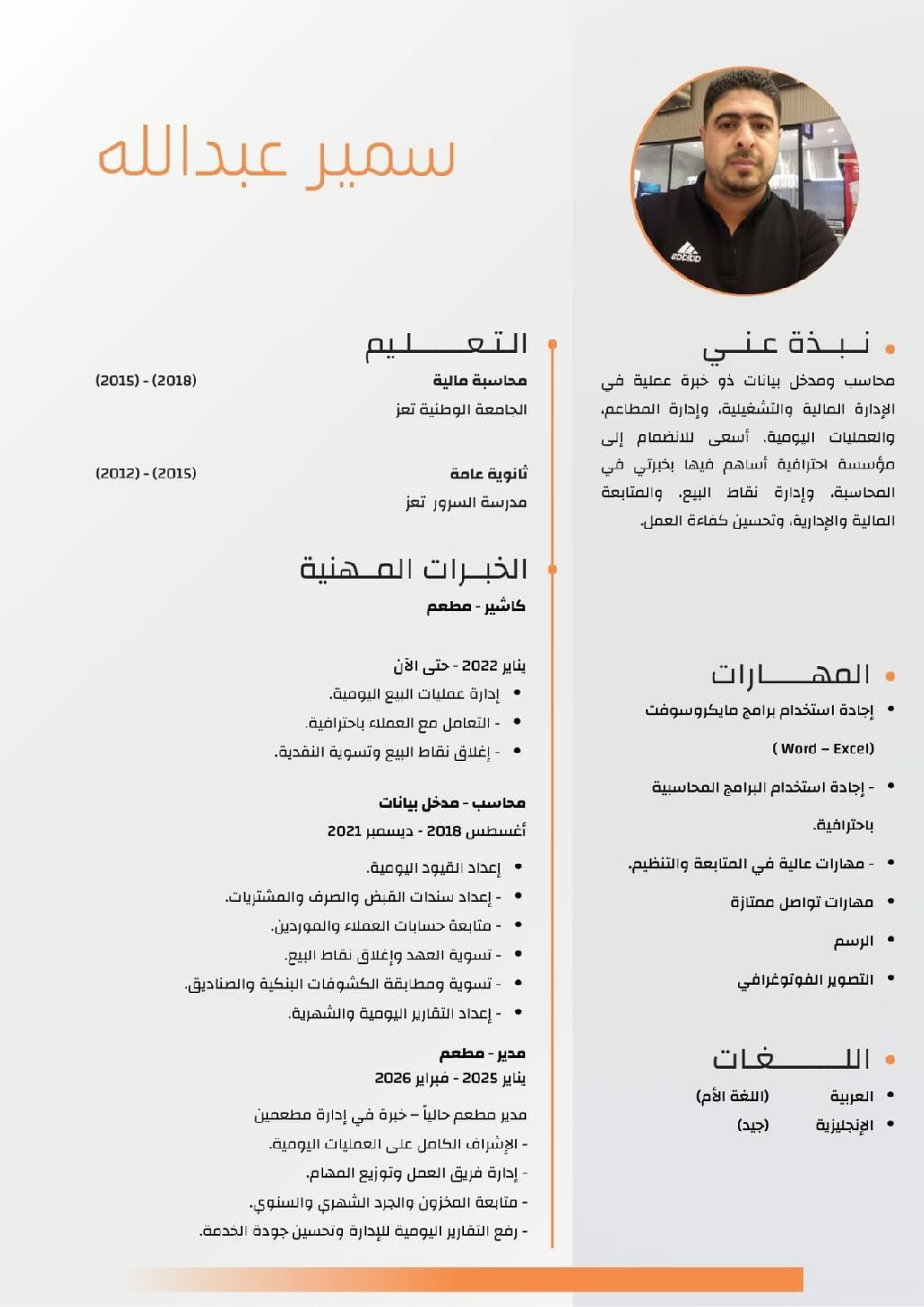 السيرة الذاتية الاسم سمير عبدالله العمر 30 سنة الجنسية يمني الإقامة سارية - امكانية نقل كفالة جاهز لمباشرة العمل فورا - الهدف المهني محاسب ومدخل بيانات ذو خبرة عملية في الإدارة المالية والتشغيلية، وإدارة المطاعم، والعمليات اليومية. أسعى للانضمام الى مؤسسة احترافية أساهم فيها بخبرتي في المحاسبة، وإدارة نقاط البيع، والمتابعة المالية والادارية، وتحسين كفاءة العمل. الخبرات العملية