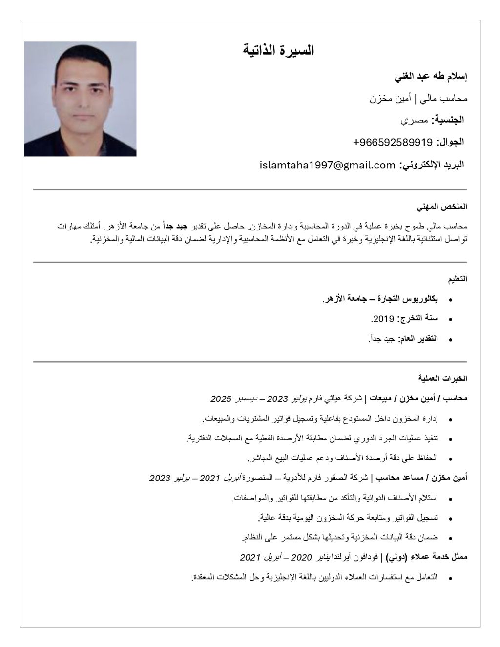 العنوان محاسب مالي وأمين مخزن - تقدير جيد جدا - خبرة 4 سنواتا لمؤهل بكالوريوس تجارة، جامعة الأزهر (2019) تقدير جيد جدا. الخبرة محاسب ومساعد محاسب وأمين مخزن في شركات ادوية وأغذية (2021 - 2025) المهارات الفنية اعداد القيود، ميزان المراجعة، القوائم المالية، وإدارة الذمم المدينة والدائنة. المخازن اجادة الجرد الدوري، تسجيل فواتير المشتريات والمبيعات، وضمان دقة الأرصدة. اللغات والتقنية انجليزية ممتازة