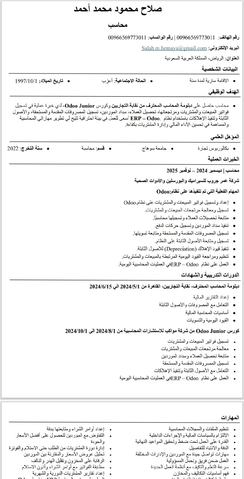 مصري الجنسية حاصل علي بكالوريوس تجارة مقيم في الرياض خبرة بمجال الحسابات من تسجيل قيود العمليات المختلفة وفواتير المبيعات والمشتريات ومطابقه الحسابات للعملاء والموردين القدرة علي استخدام البرامج المحاسبية ERP junior odoo accountant خبرة باستخدام برامج الكمبيوتر Microsoft office world & excel وبرامج ادخال البيانات القدرة علي العمل تحت ضغط وضمن فريق وتنظيم المهام والوقت إقامة سارية وقابلة للنقل