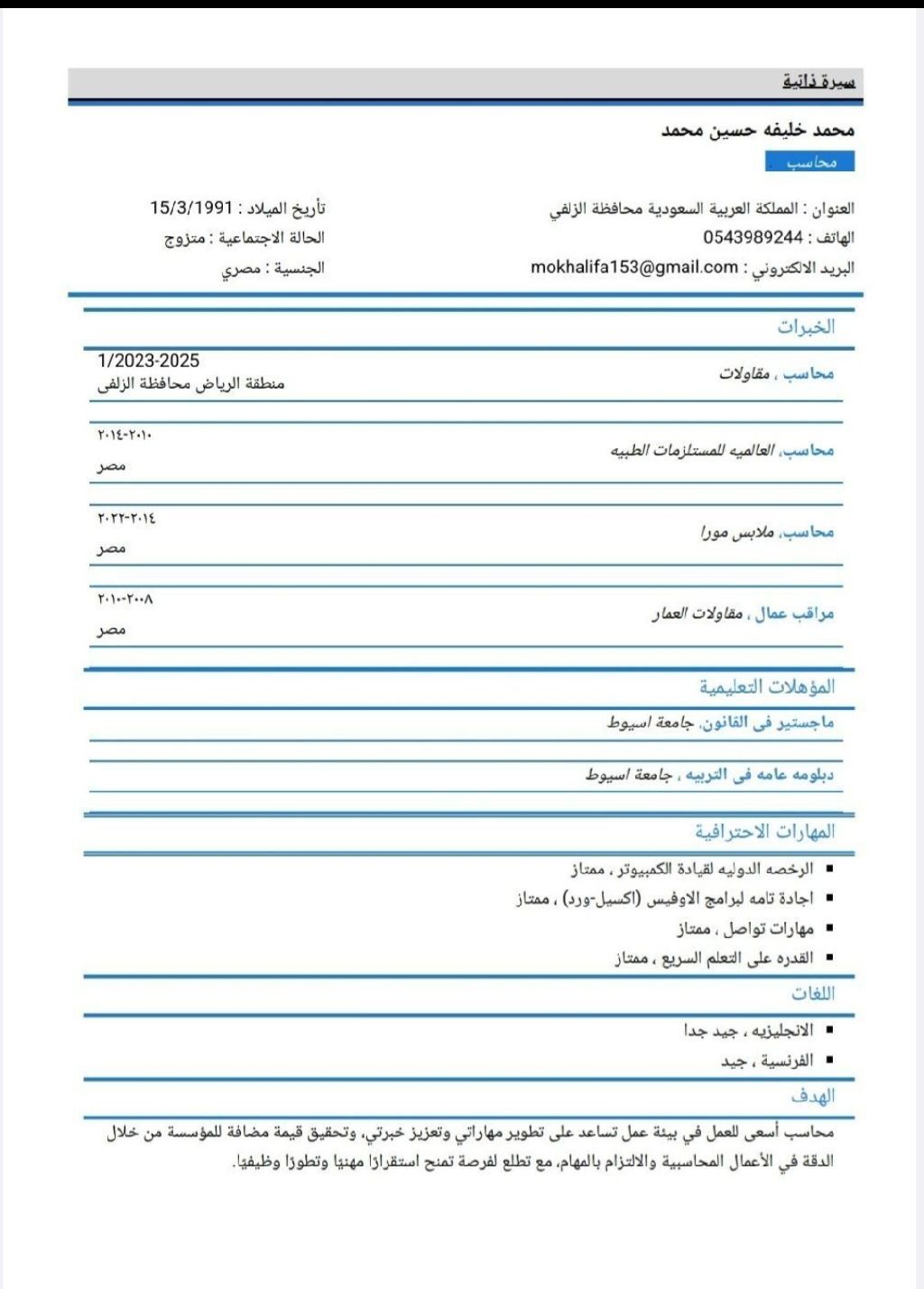ابحث عن عمل مناسب محاسب أو كاشير أو بائع خبرة في حسابات المقاولات في المملكة لمدة سنتين