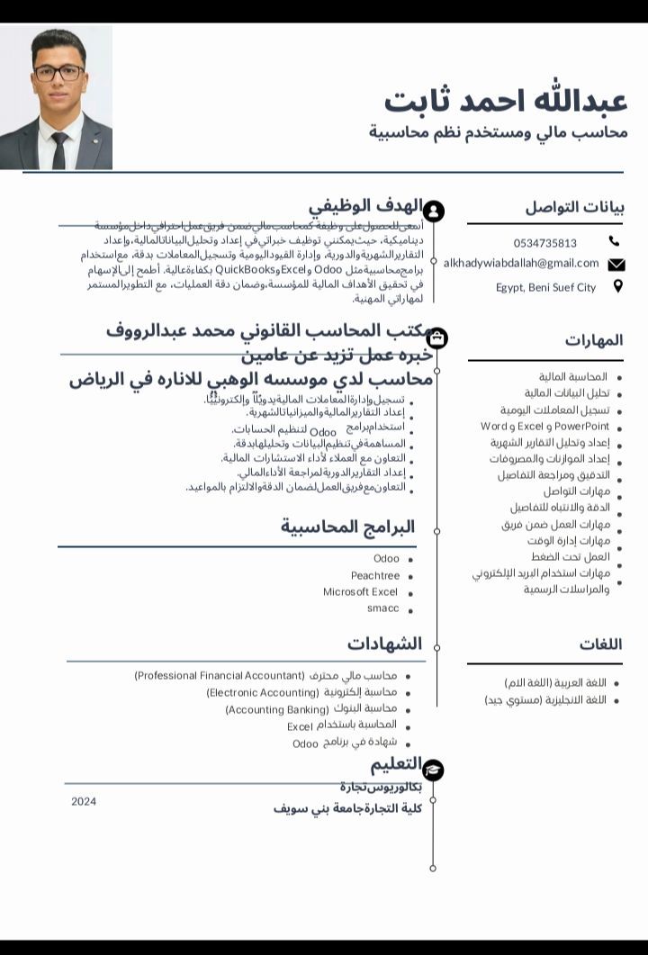 محاسب مالي مصري ابحث عن عمل في الرياض لدي خبرة عامين لدي مكتب محاسب قانوي ومحاسب في مؤسسة ألوه بي للانارة في الرياض أجيد التعامل مع برنامج erp Excel وsmacc وعمل قيود اليومه وتقفيل الشهر ومطابقه ارصده العملاء والموردين وارصده البنك