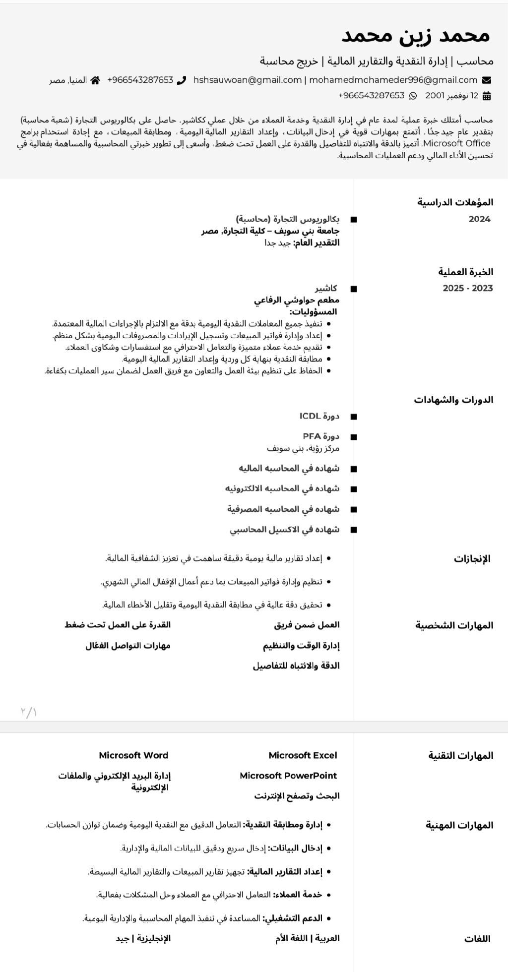 محاسب حديث التخرج حاصل على بكالوريوس تجارة قسم محاسبة بتقدير عام جيد جدا خريج عام 2024 - المؤهلات العلمية بكالوريوس تجارة، قسم محاسبة - كورس PFA (Personal Financial Adviser) كورس ICDL (International Computer Driving License) المهارات محاسبة - إدارة المال - مهارات الكمبيوتر - Excel - word - لغة انجليزية (جيدا) الهوايات التعلم - التطور - لدي اقامة سارية لمدة عام والمهنة عامل عادي لم أنقل كفالة من قبل