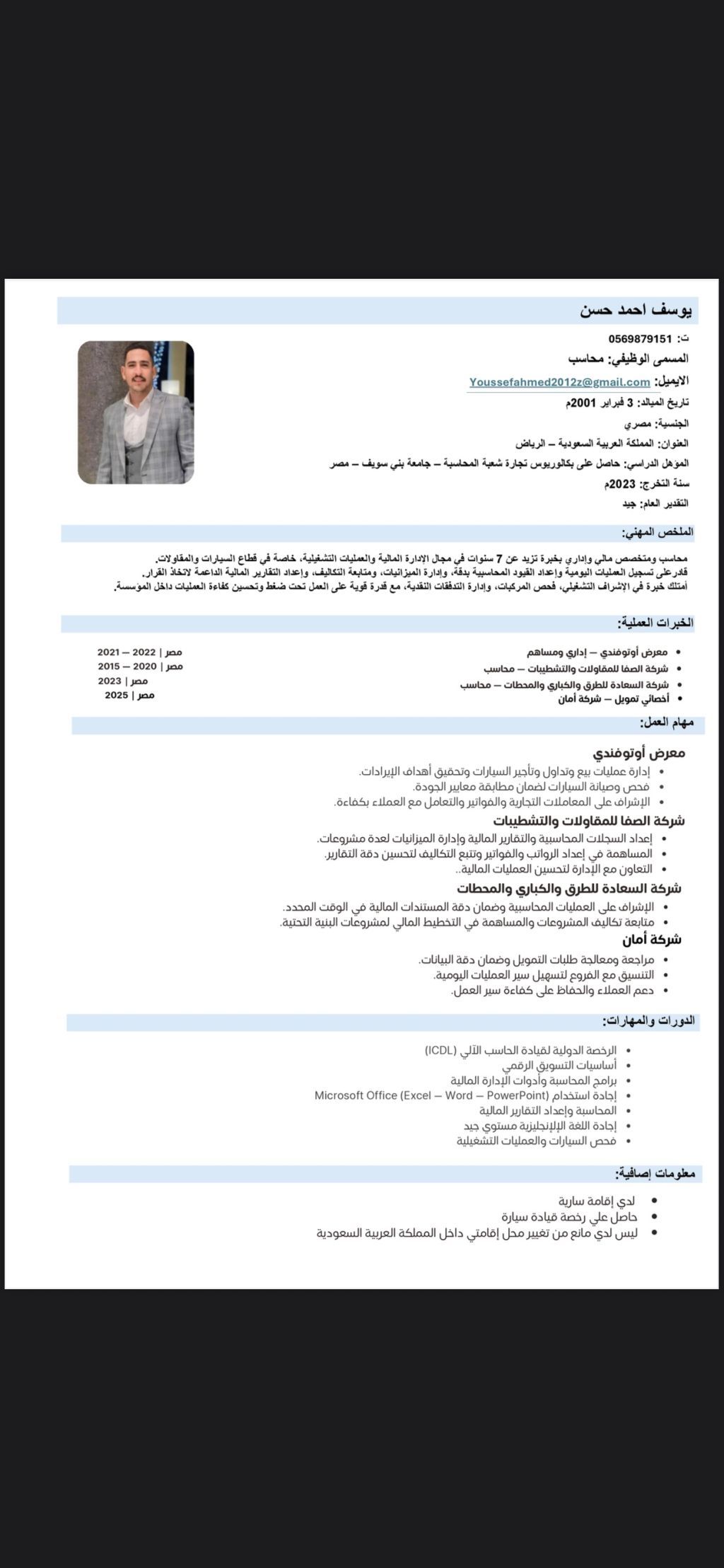 محاسب خبرة 4 سنوات قادر علي تسجيل العمليات الحسابية بدقة وأمانة وقادر علي اعداد القوائم المالية ورفع الاقرارات الزكوية والضريبية والتعامل مع المنصات الالكترونية بسهولة وسلاسة وماهر في استخدام الاكسل والورد وجيد في اللغة الانجليزية أحمل إقامة سارية