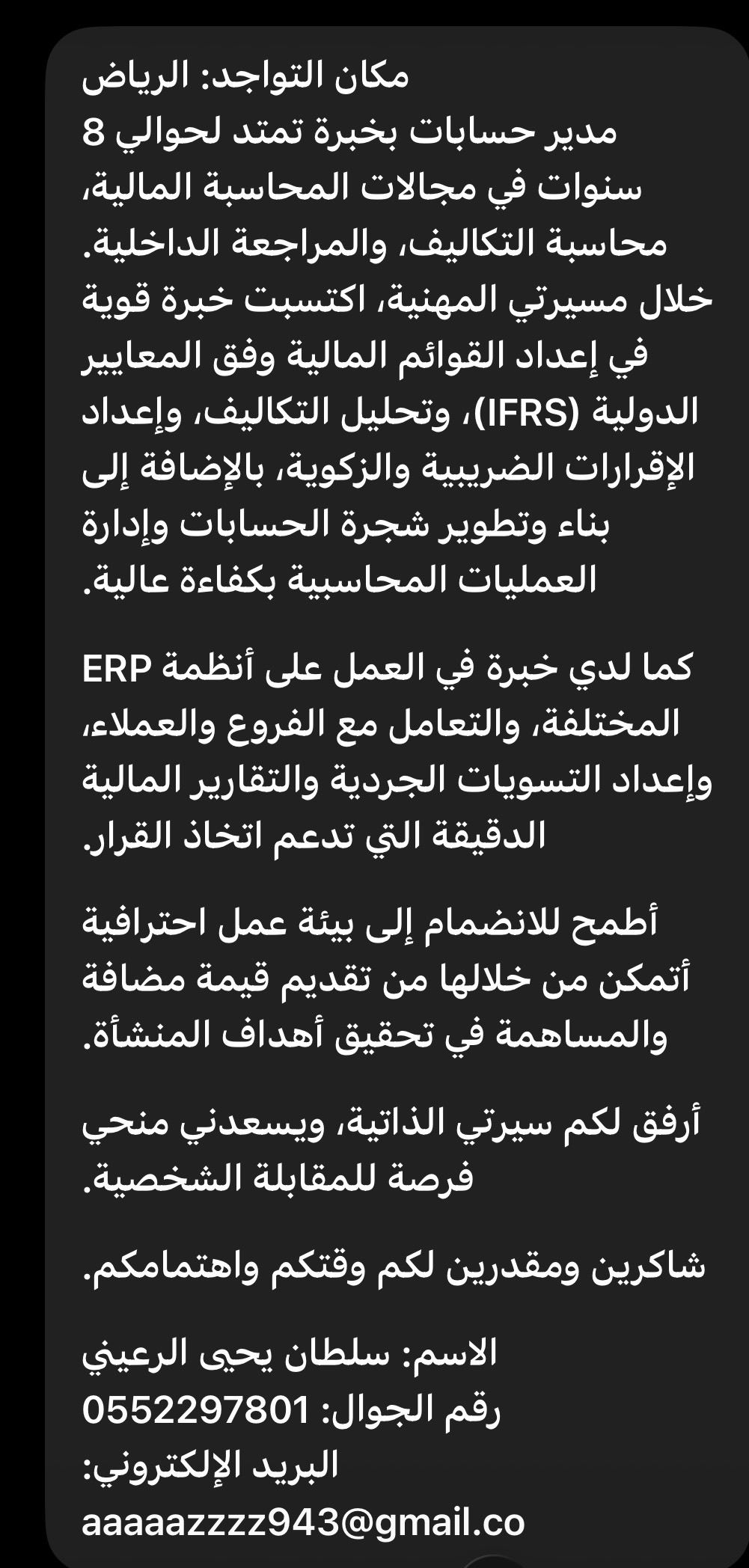 مدير حسابات يمني متواجد في الرياض بخبرة تقارب 8 سنوات في المحاسبة المالية، التكاليف، والمراجعة الداخلية، وحاصل على عضوية الهيئة السعودية للمراجعين والمحاسبين. لدي خبرة في اعداد القوائم المالية وفق IFRS، تحليل التكاليف، الاقرارات الضريبية والزكوية، وبناء شجرة الحسابات. أجيد العمل على أنظمة ERP واعداد التقارير والتسويات بدقة، وأسعى لبيئة احترافية أقدم فيها قيمة مضافة