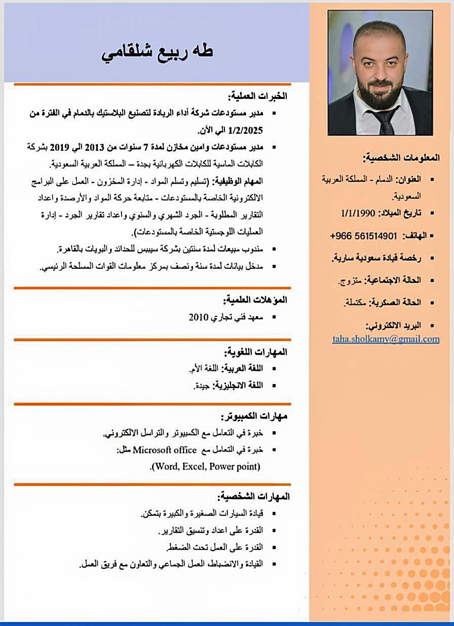 مدير مخازن وأمين مستودعات خبرة سبع سنوات في ادارة مخازن ومستودعات مصانع الكابلات الكهربائية ومصانع اعادة تدوير وتحبيب البلاستيك وأجيد العمل على برامج المخازن وحزمه Microsoft office وأجيد قيادة جميع السيارات والرفعات الفوركلفت إقامة سارية ورخصة سارية ومقيم في الدمام وجاهز للعمل فورا للعمل