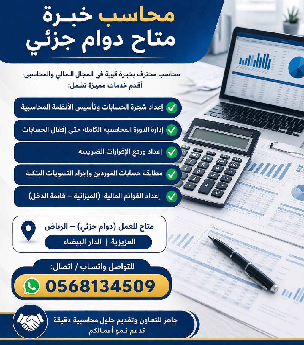محاسب خبرة - متاح دوام جزئي محاسب محترف بخبرة قوية في المجال المالي والمحاسبي، أقدم خدمات احترافية تساعد في تنظيم وتحسين الأداء المالي لمنشأتك، وتشمل اعداد شجرة الحسابات وتأسيس الأنظمة المحاسبية إدارة الدورة المحاسبية الكاملة حتى أقفال الحسابات اعداد ورفع الاقرارات الضريبية مطابقة حسابات الموردين وإجراء التسويات البنكية اعداد القوائم المالية (الميزانية - قائمة الدخل)