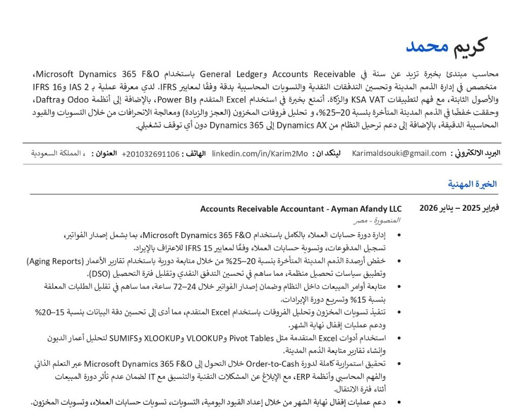 محاسب مبتدئ بخبرة تزيد عن سنة في Accounts Receivable وGeneral Ledger باستخدام Microsoft Dynamics 365 F O متخصص في إدارة الذمم المدينة وتحسين التدفقات النقدية والتسويات المحاسبية بدقة وفقا لمعايير IFRS. لدي معرفة عملية ب IAS 2 وIFRS 16 والأصول الثابتة، مع فهم لتطبيقات KSA VAT والزكاة. أتمتع بخبرة في استخدام Excel المتقدم وPower BI، بالاضافة الى أنظمة Odoo وDaftra، وحققت خفضا في الذمم المدينة المتأخرة