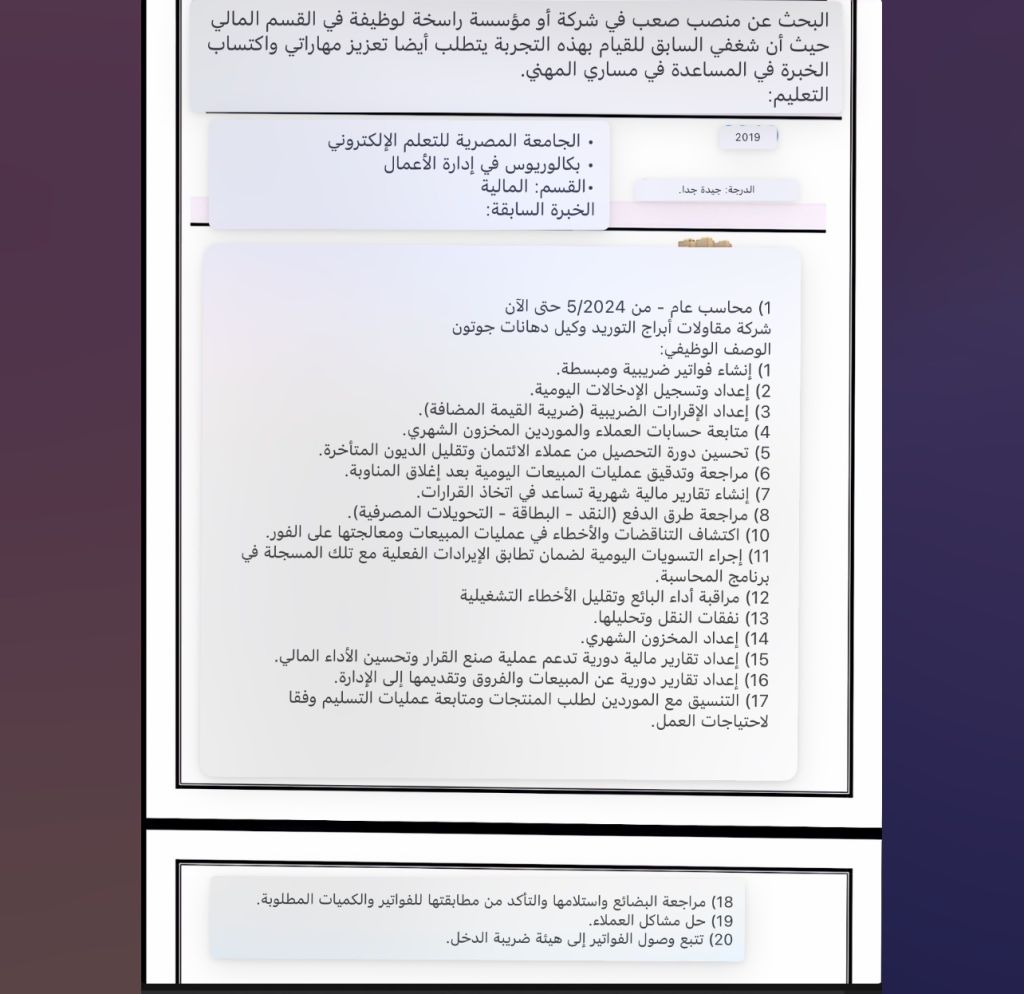 يوجد خبرة 3 سنوات داخل المملكة في الحسابات اليومية وأنظمة ERP وعمل الاقرار الضريبي جاهز للعمل فورا متاح نقل كفالة