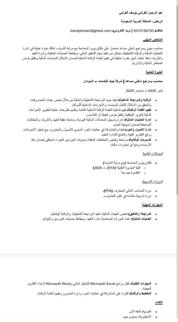 أنا عبد الرحمن القرشي من السودان وعمري 25 سنة امتلك معرفة جيدة في أساسيات المحاسبة واعداد التقارير المالية، اضافة الى القدرة على التعامل مع البرامج المحاسبية والعمل بدقة وتنظيم. أسعى دائما الى تطوير مهاراتي المهنية، كما أتميز بالالتزام، والعمل بروح الفريق وتحمل ضغط العمل