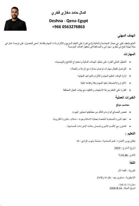 أحمد محاسب عام مصري خبرة 6 أعوام في الرياض أقامه سارية اعداد دورة مستندية ماليه لشركات تجارية ومقاولات وخدمات واعداد شجرة حسابات بشكل احترافي وتسجيل العمليات الماليه بشكل قيد يومي خبرة بالبرامج المحاسبية أودو - قيود - سماك - كويك بوكس - ذوهواوا خبرة ببرامج نقاط البيع ومشرف ومراجع داخلي عليها مثل برنامج مرن وبرنامج رواء خبرة بالمراجعة الماليه ومراقبة التكاليف والمشتريات اعداد ضريبة القيمة المضافة