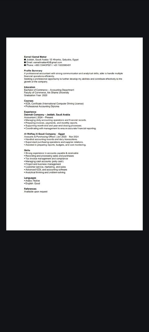 رئيس حسابات خبرة كبيرة بالحسابات داخل المملكة، اجادة التعامل مع برامج المحاسبة ERP مثل SAP والمتكامل اعداد التقارير والقوائم المالية والموازنات التقديرية والتدقيق المالي ومراقبة التدفق النقدي متابعة الحسابات البنكية ومطابقتها واعداد التسويات البنكية، الامتثال الضريبي ورفع ضريبة القيمة المضافة وتسجيل ومتابعة حسابات الموردين والعملاء ومطابقتها، ومراقبة المخزون واعداد وتنظيم عمليات الجرد السنوية والشهرية