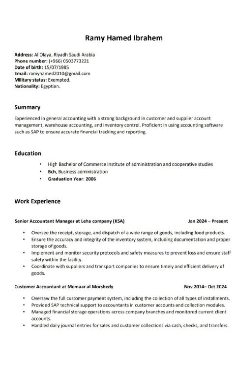 Senior accountant and manager of 9 - year experience in managing all accounts, review, audit of accounting and financial management within one company, which indicates stability and commitment. Experience in preparing and providing VAT (according to the Zakat, Tax and Customs Authority systems. A valid work residence and the immediate workplace immediately. Name Naguib Radwan Ali Al - Aidaros