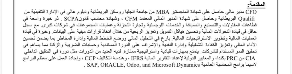 A financial manager with an MBA, SCPA and CFM certification, with extensive experience in leading financial operations and developing financial strategies to achieve corporate goals. He is proficient in financial analysis, developing financial plans, and managing risks to ensure improved financial performance, enhanced operational efficiency, cash management, and supervision of the documentary cycle