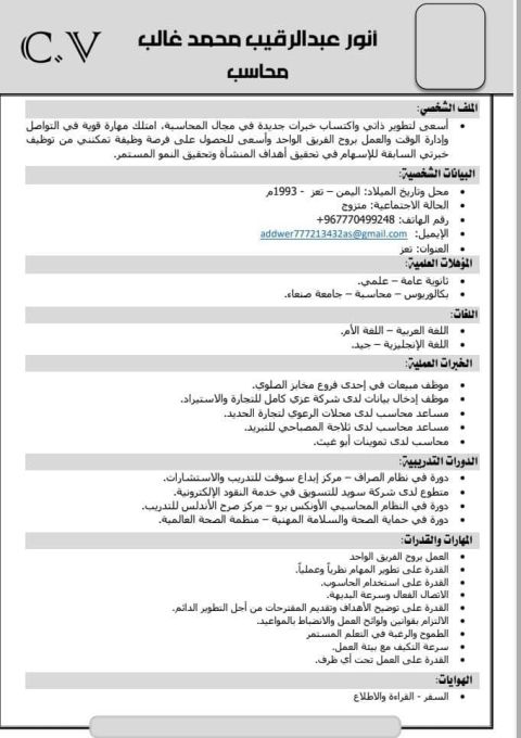 محاسب، يمني الجنسية متواجد في الرياض حديث الدخول الى المملكة امتلك خبرة في الحسابات والمخزون والمشتريات عملت سابقا في شركات تجارية سلعية وخدمية في اليمن في وظائف عدة أبرزها محاسب ومدير مشتريات أجيد عمل القيود ومعالجة الأخطاء المحاسبية ومتابعة المصروفات والايرادات والجرد وإدارة قسم المشتريات