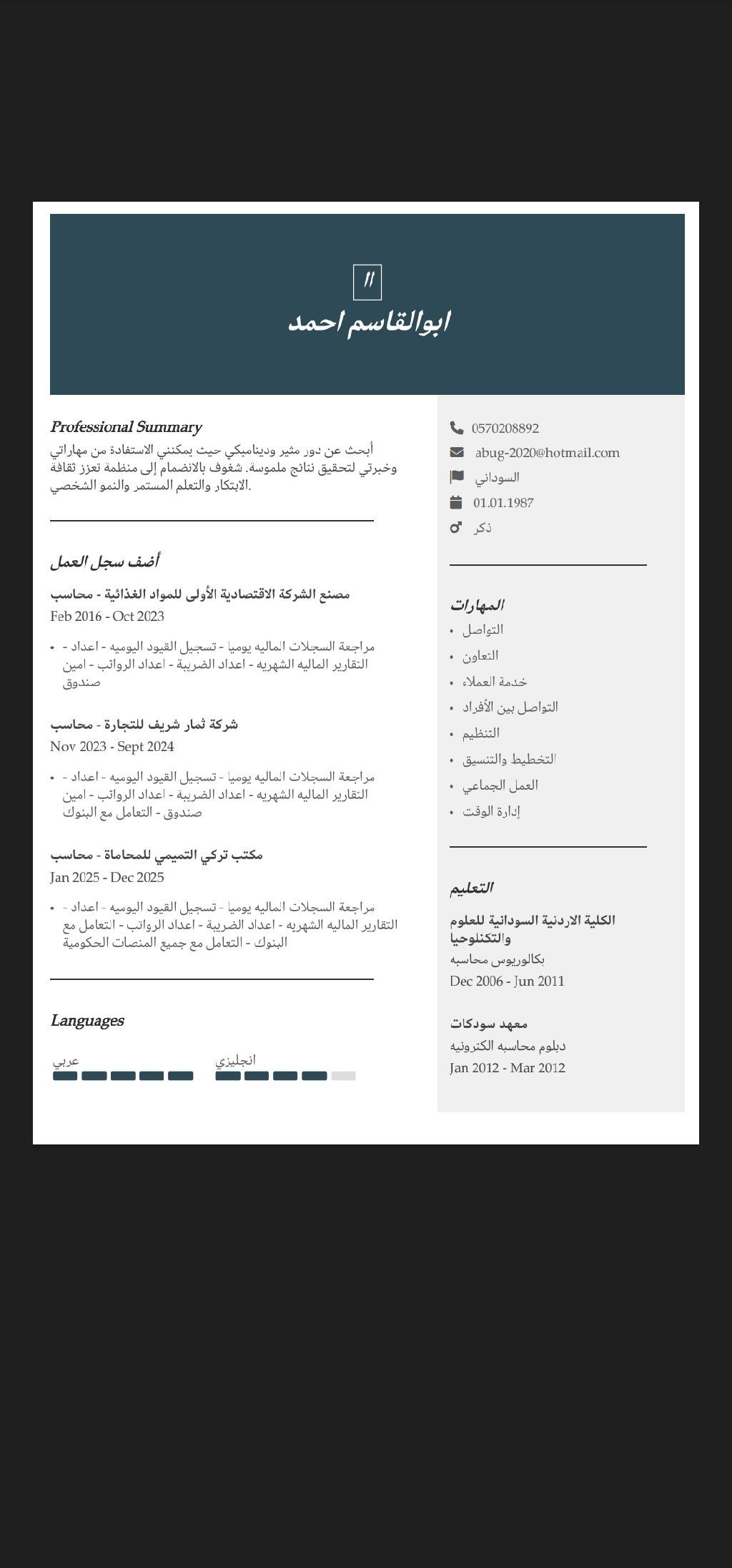 محاسب سوداني خبرة أكثر من 10 سنين حيث اعمل محاسب منذ 2016 الى الآن أجيد اعداد التقارير الماليه الشهريه والاعداد الضريبي وجميع المنصات الحكومية ابحث عن فرصة عمل جديدة وتحدي جديد حتى أستطيع التطوير من نفسي أكثر أستطيع العمل على جميع البرامج المحاسبية