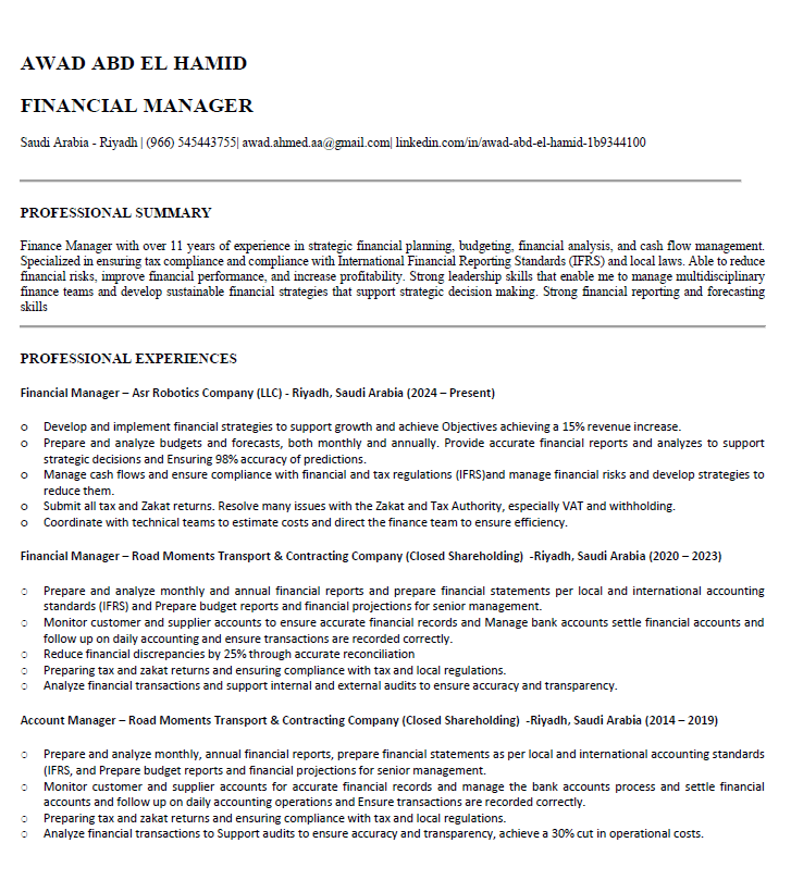 An Egyptian financial manager with more than 10 years of experience in the kingdom in the field of financial management, financial analysis, budgeting, preparing tax returns, Zakat, tax compliance and applying international accounting standards, and experience in using accounting programs ERP. Oracle, Odoo, and experience in many sectors, especially car rental, contracting and Information Technology