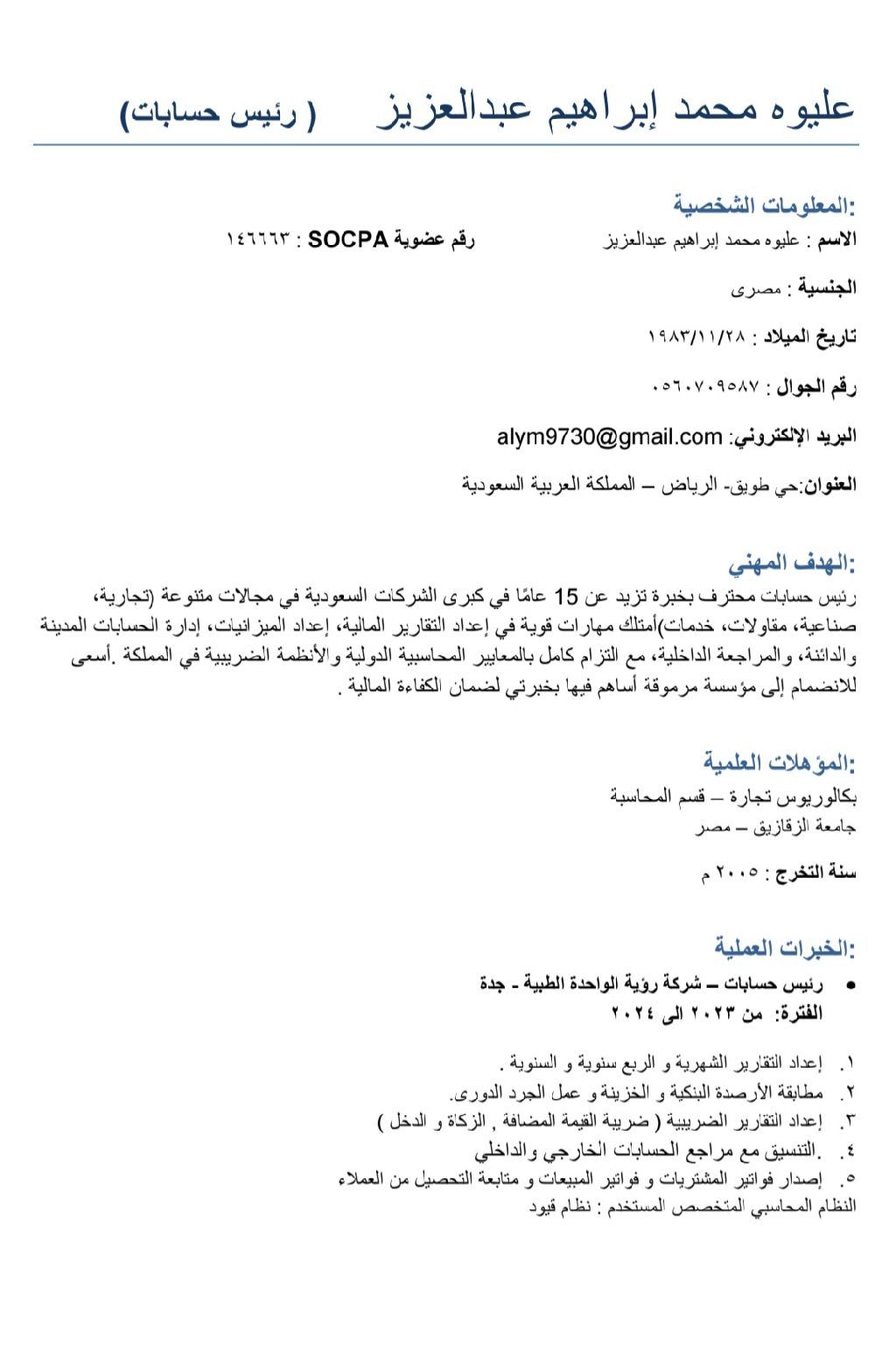 رئيس حسابات خبرة في اعداد نظام محاسبي متكامل بداية من اعداد قيود اليوميه وعمل التقارير الشهريه ورفع الاقرار الضريبي وصولا لعمل الحسابات الختامية العمل علي البرامج المحاسبية قيود ودفترة وفالكون وسماك كلاود وبرامج الأوفيس وأونكس برو ووافق وقلاري