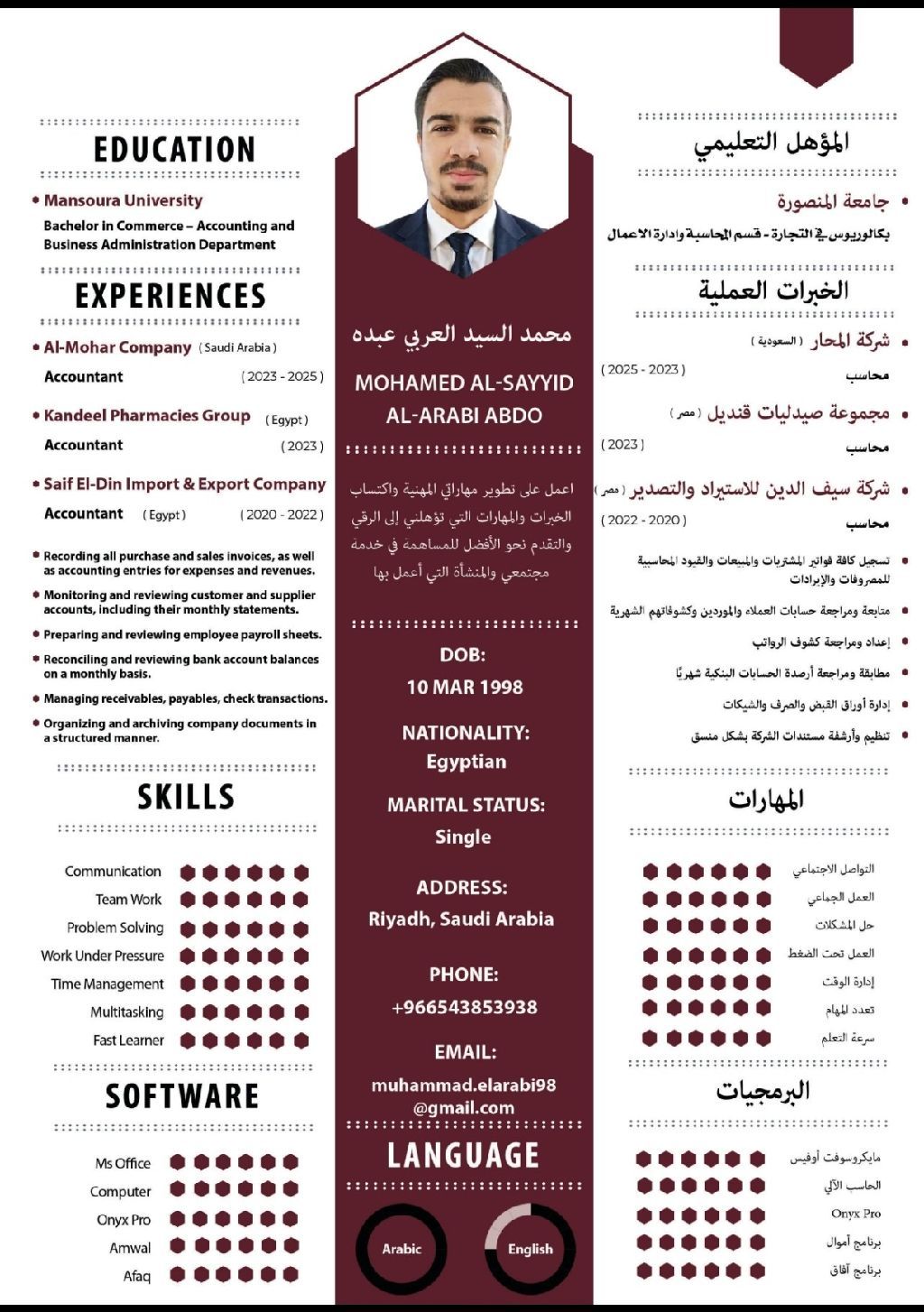 My name is Mohamed Al - Arabi. I worked as an accountant in Egypt for 3 years and in Saudi Arabia for a year and a half. I am looking for work as an accountant, cashier, or storekeeper