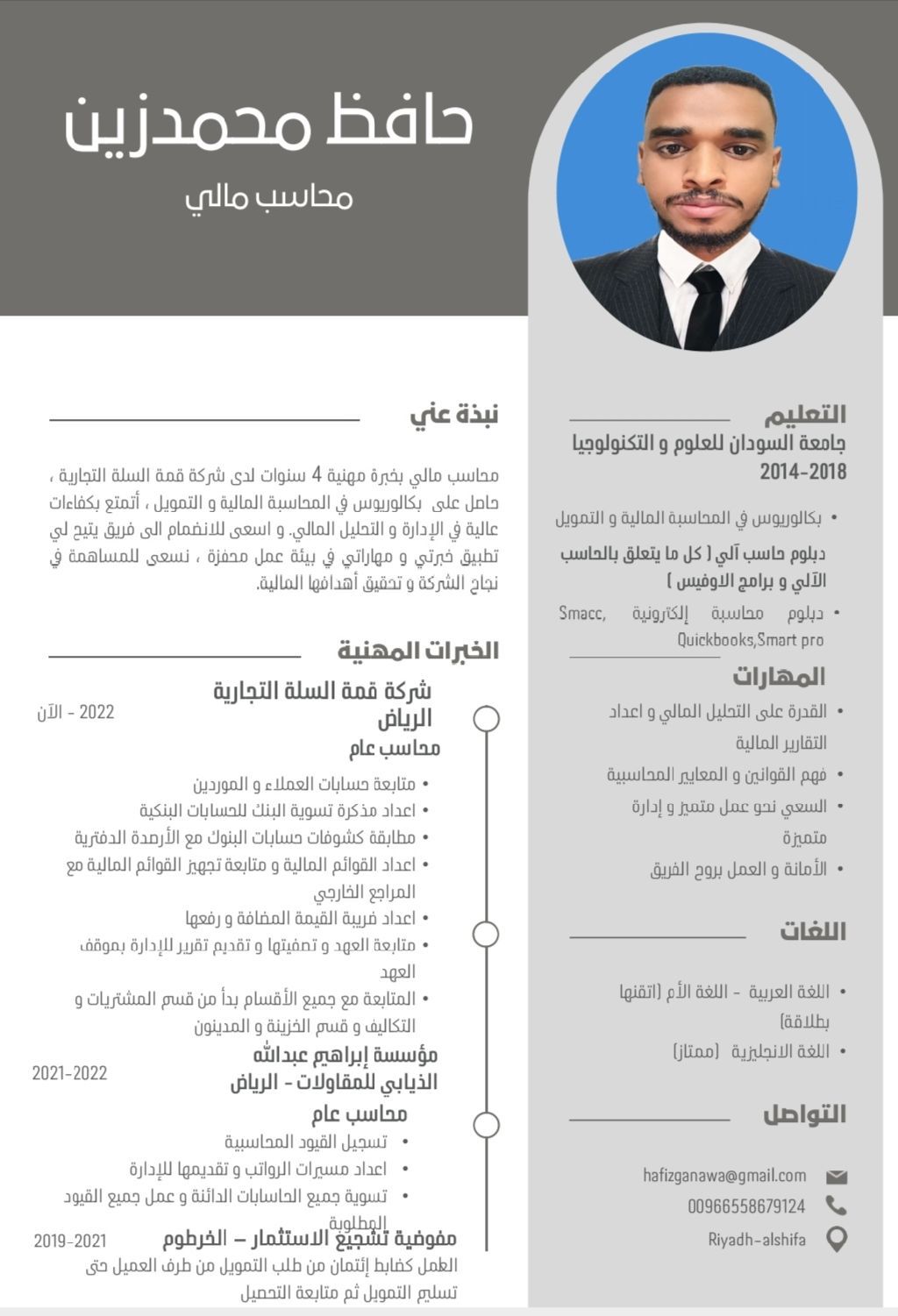 حافظ محمد زين أحمد محاسب سوداني خبرة 5 سنوات في مجال المحاسبة في المملكة العربية السعودية حاصل على بكالوريوس في المحاسبة المالية والتمويل أتمتع بكفاءات عالية في الإدارة والتحليل المالي أسعى للانضمام الى فريق يتيح لي تطبيق خبرتي ومهاراتي في بيئة عمل محفزة. التواصل جوال اتصال
