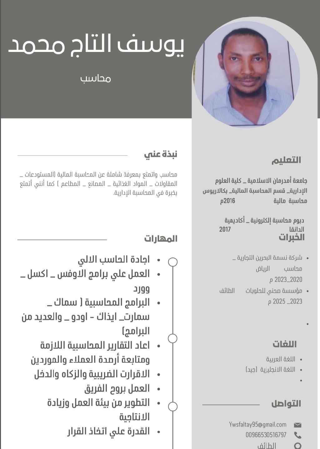 محاسب سوداني خبرتي في السعودية 5 سنوات اشتغلت على العديد من البرامج المحاسبية كما أجيد معرفة (الدخل. الخرج. التقرير اليومي. الاقرار الضريبي ورفعه للزكاة والدخل. وكذلك متابعه المناديب بكافة أنواعها) إقامة سارية ابحث عن عمل حاليا في الطائف التواصل على الرقم اتصال