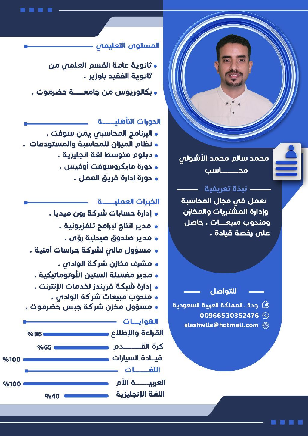 حضرمي محاسب مبتدئ عندي خبرة في استخدام الحاسب الآلي والأنظمة المحاسبية وعملت أمين مستودع في شركة في المملكة وعندي رخصة قيادة سيارة