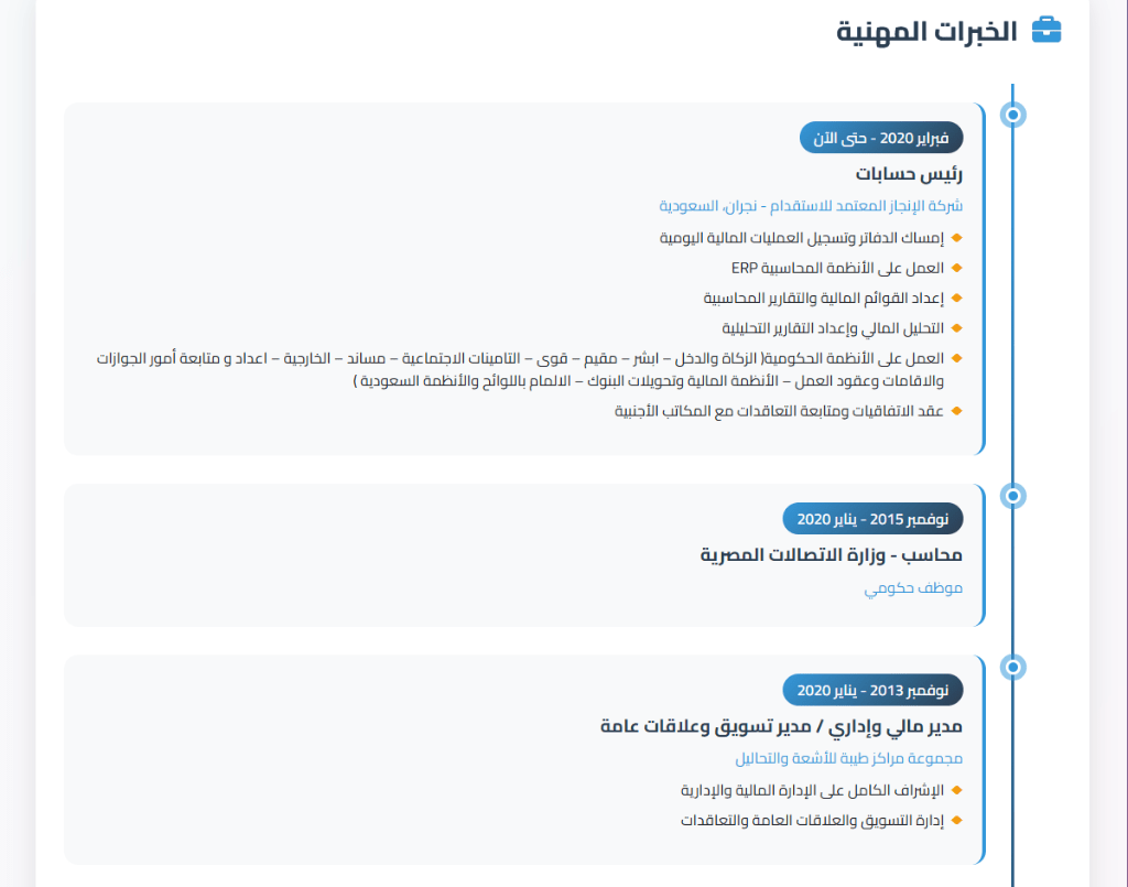 محاسب اداري ومالي بخبرة أكثر من 15 سنة في مجال المحاسبة والإدارة المالية، حاصل على بكالوريوس تجارة وإدارة أعمال من جامعة حلوان - 2010. عمل في عدة قطاعات داخل مصر والسعودية منها القطاع الطبي وشركات الاستقدام والمحاسبة العامة. يشغل حاليا رئيس قسم الحسابات في شركة الانجاز المعتمد للاستقدام - نجران، السعودية منذ فبراير 2020 حتى الآن. يمتلك خبرة شاملة في اعداد القيود اليومية والدفاتر المحاسبية ومتابعة