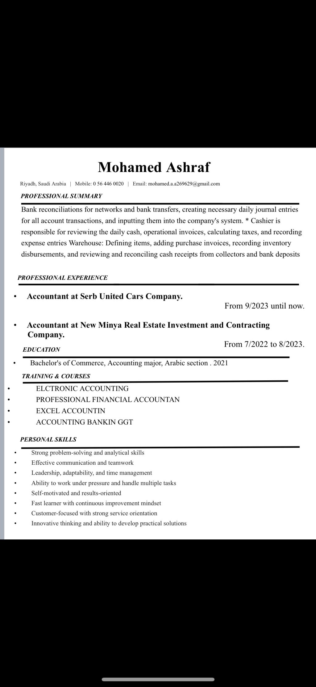 محاسب خريج كلية التجارة جامعة بني سويف دفعة 2021 حاصل علي دورات تدريبية Pfa لدي خبرة عملية 3 سنوات بالمملكة محاسب بشركة تأجير السيارات والليموزين اجادة عمل القيود اليومية اعداد التقارير اليومية والشهرية تنظيم وادارة شبكات الدفع الالكتروني اجادة عمل التسويات البنكية وادارة المخازن بالاضافة الى العمل التشغيلي الاداري والعمل ضمن فريق أو العمل الفردي أجيد التعامل علي برامج Erp أكسا المحاسبي