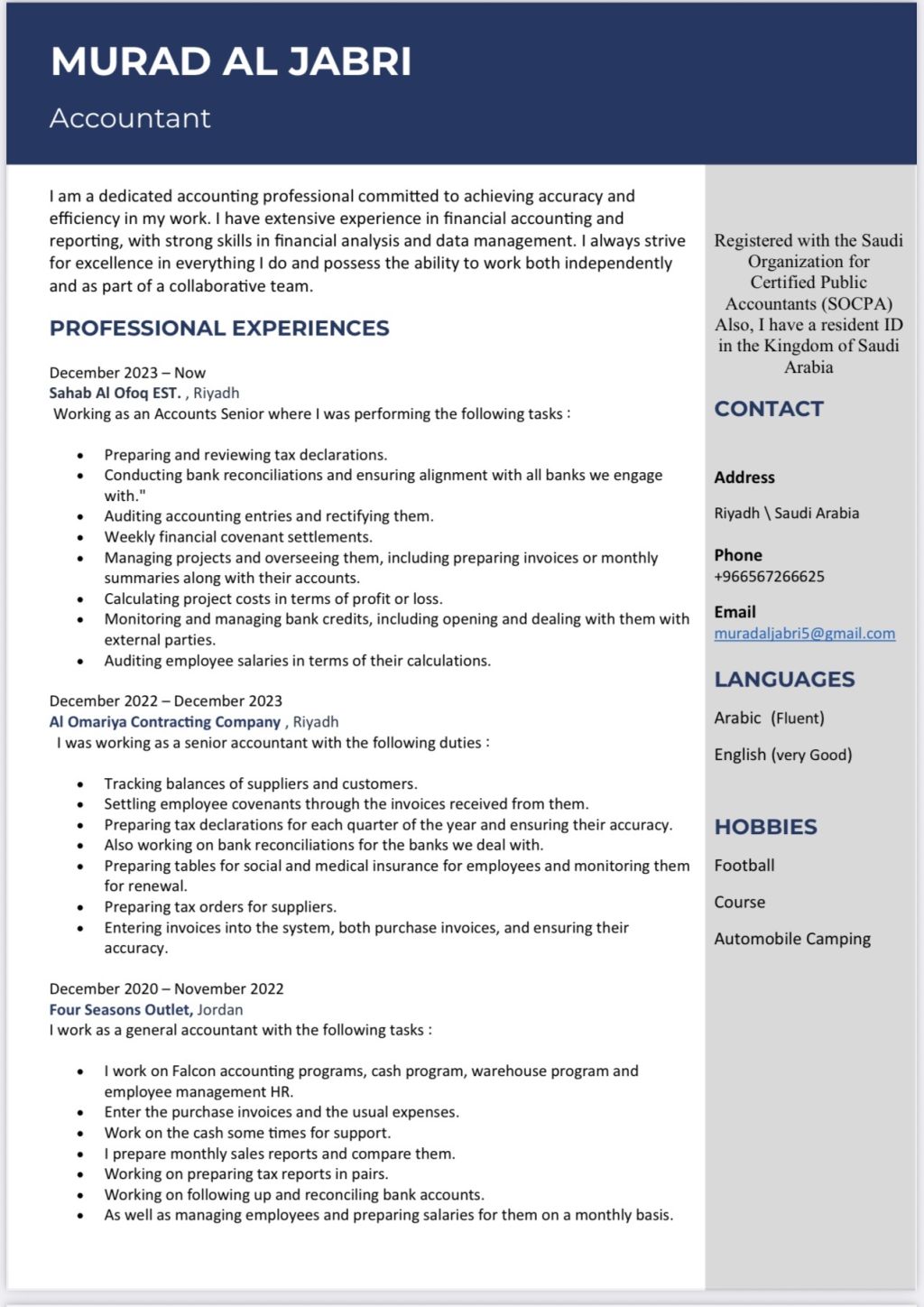 I am Murad Al - Jabri, an accountant with 5 years of experience. I hold a Bachelor’s degree in Accounting (English program) with honors. I am seeking a suitable accounting position. Please find my CV attached for your consideration