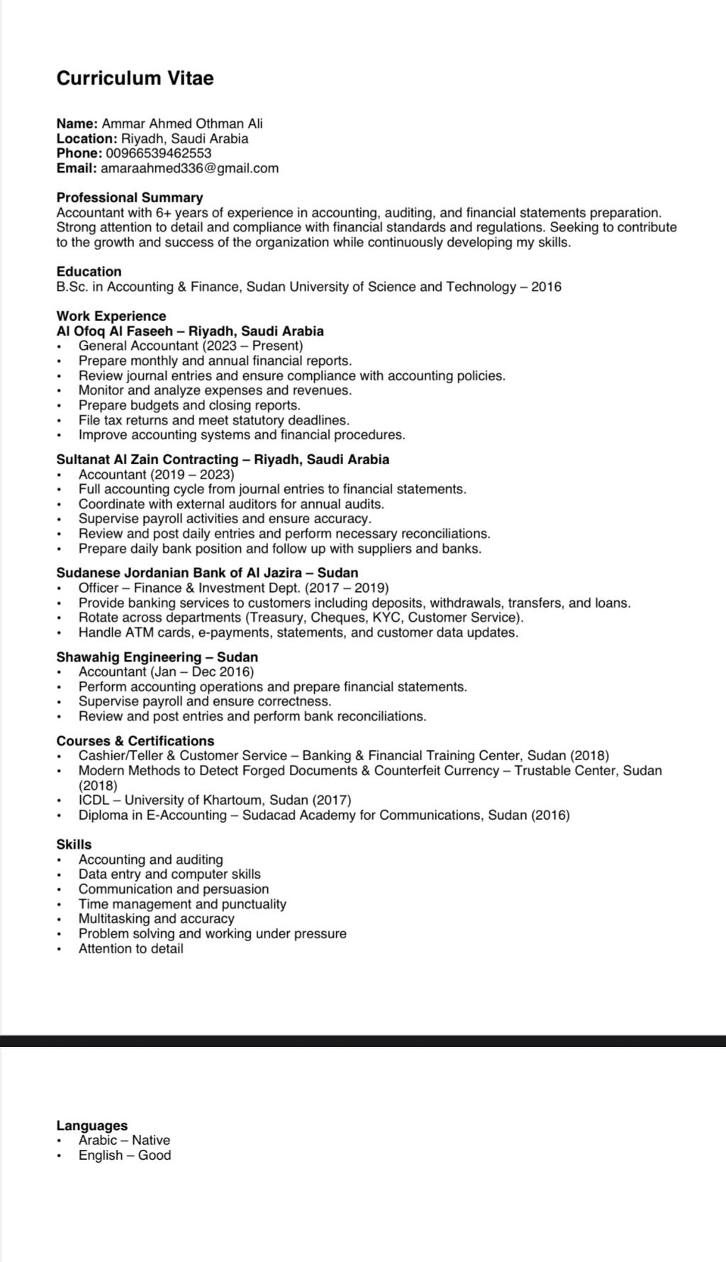 Professional Summary Accountant with 6 + years of experience in accounting, auditing, and financial statements preparation. Strong attention to detail and compliance with financial standards and regulations. Seeking to contribute to the growth and success of the organization while continuously developing my skills