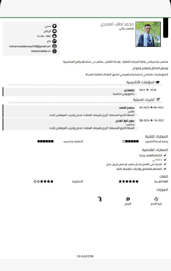 أنا محاسب عندي خبرة في مجال محاسبه وحتى محاسب تكاليف وأيضا عندي خبرة في مجال الكاشير وعند خلفية في مجال التسويق