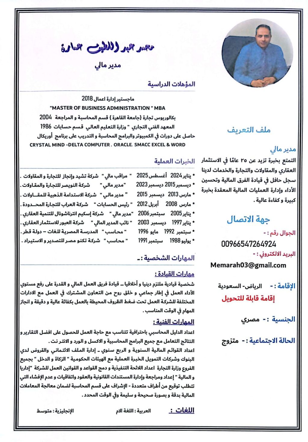 مدير مالي خبرة أكثر من 22 عام في الادارة المالية قطاع المقاولات والتجاري والخدمات اعداد الدليل المحاسبي بمهارة وكفائه عالية بما يتناسب مع الشركة والتعامل مع جميع البرامج المحاسبية اعداد القوائم المالية السنوية والربع سنوية والتقارير المالية الشهريه ادارة الملف الائتماني لدي البنوك وشركات التمويل اعداد الاقرار الشهري الزكاة والدخل - الضريبي اعداد اللائحة التنفيذية المالية الشركة الاشراف المالي