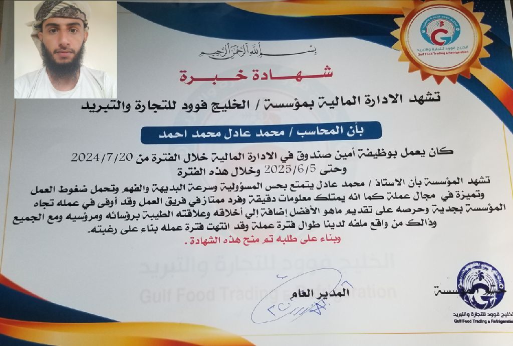 أنا محمد من اليمن لدي اقامة 3 أشهر بعد ذلك نقل كفالة ابحث عن عمل قد اشتغلت في عدة محلات ومؤسسات في اليمن كاشر مبيعات أمين صندوق ما يقارب 5 سنوات ولدي شهادة خبرة مستعد اشتغل أي شغل أهم شيء الصلاة أو إمام مسجد مستعد إن شاء الله وصاحب العمل سيرى مني كل خير سيراني فاعلا كل ما يرضي الله ثم يرضيه ومتجنبا لكل ما يغضب الله ثم يغضبه عملك هو عملي وأمانة وسأحاسب عليها أمام الله يوم القيامة