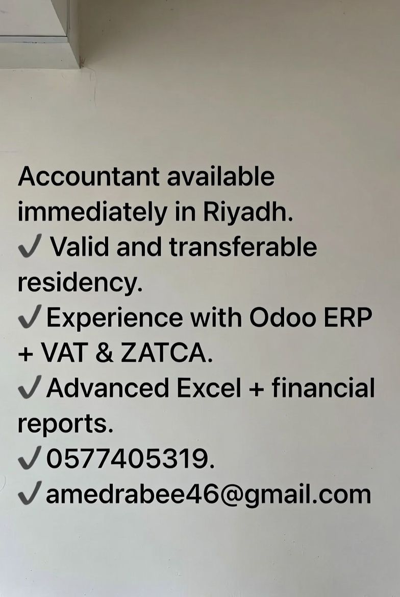 محاسب متاح فورا في الرياض (إقامة قابلة للنقل) أنا أحمد ربيع، محاسب عام بخبرة 3 + سنين في إدارة الحسابات والتقارير المالية - استخدام Odoo ERP وAl - Ameen - Excel متقدم (جداول، تحليل بيانات) VAT & ZATCA Compliance (اعداد فواتير، تقديم اقرارات) إدارة فرق ومخازن (ترقية سابقة لمدير معرض) آخر عمل محاسب عام مصنع سانيورا (أكتوبر 2024 - حاليا) محاسب موقع ورث يسري وأبو الفتوح للمقاولات