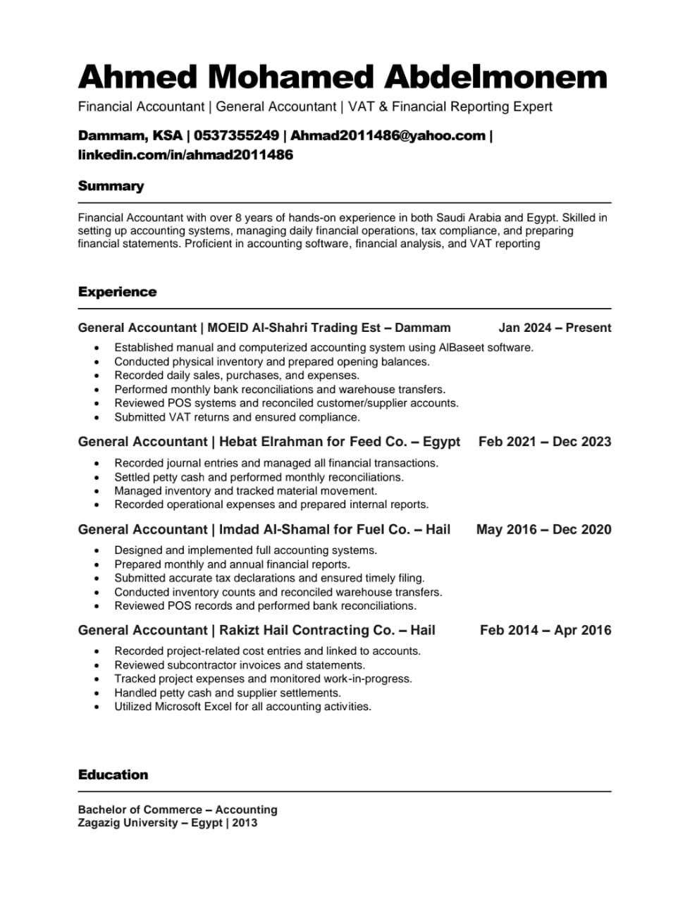 محاسب عام - خبرة 8 سنوات - جاهز للعمل فورا محاسب مالي بخبرة أكثر من 8 سنوات داخل المملكة العربية السعودية ومصر، عملت في شركات مقاولات، تجارة، ووقود، ولدي خبرة قوية في تأسيس الأنظمة المحاسبية وتنظيم الدورة المستندية من البداية. أهم المهام والخبرات اعداد وتسجيل القيود اليومية للمبيعات والمشتريات والمصروفات. تأسيس وتطوير الأنظمة المحاسبية وربطها في الدورة المستندية. جرد المخزون والأصول الثابتة والمتداولة