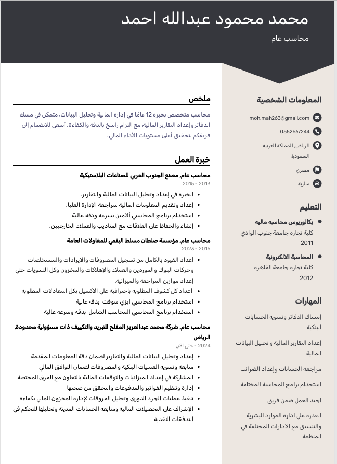 محاسب متخصص بخبرة 12 عاما في إدارة المالية وتحليل البيانات متمكن في مسك الدفاتر واعداد التقارير المالية، مع التزام راسخ بالدقة والكفاءة. إقامة سارية ورخصة قيادة سارية أسعى للانضمام الى فريقكم لتحقيق أعلى مستويات الأداء المالي