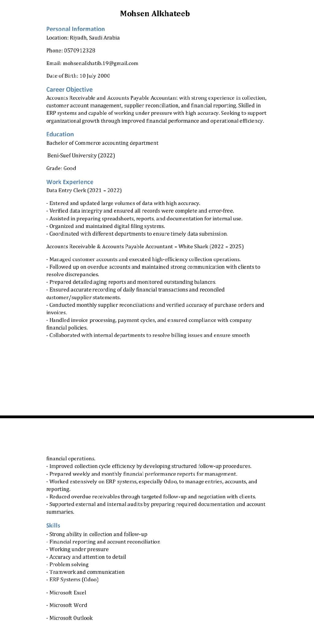 Accounts Receivable and Accounts Payable Accountant with strong experience in collection, customer account management, supplier reconciliation, and financial reporting. Skilled in ERP systems and capable of working under pressure with high accuracy. Seeking to support organizational growth through improved financial performance and operational efficiency