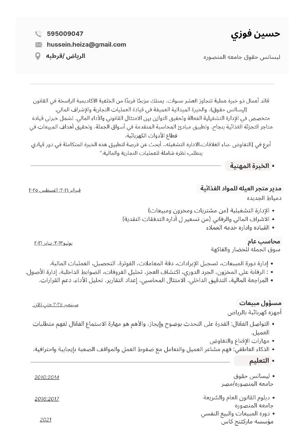 عملت كمحاسب بسوق الجملة للخضروات والفاكهة من دفتر الأستاذ الى ترحيل البضاعة المباعة لجردها ومعرفة العجز وترحيل وتنزيل المبالغ الماليه من العملاء الى اصدار الفواتير سواء للعملاء أو الموردين بالعمولة وعملت كمدير لمتجر من امور تنظيمية للمحل الى المراجعة علي الكاشيرات الى الرواتب الى إسناد المهام للعمال حوالي ما يزيد عن 40 عامل ثم عملت هنا في الرياض فترة كمسؤول مبيعات اجهزة كهربائية أتطلع لعمل وتحد جديد