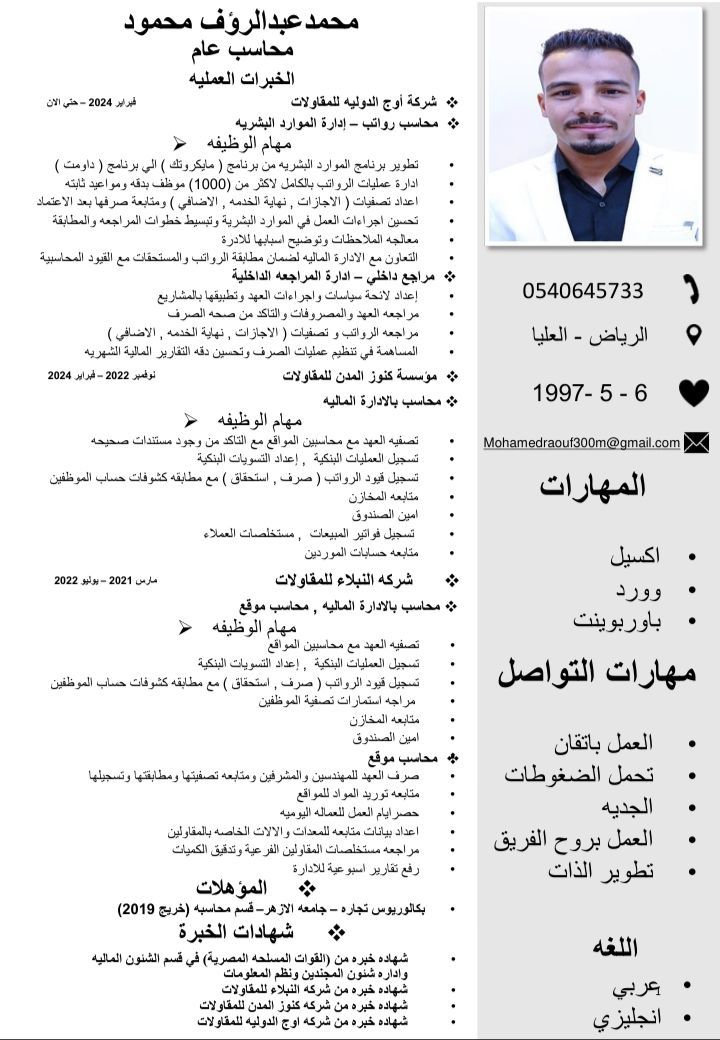 ابحث عن فرصة عمل الاسم محمد عبد الرؤوف خبرة بشركات المقاولات المهنة محاسب رواتب، محاسب HR، محاسب تصفيات عهد محاسب موقع، خبرة بالمراجعة الداخلية، محاسب بنوك، محاسب موردين