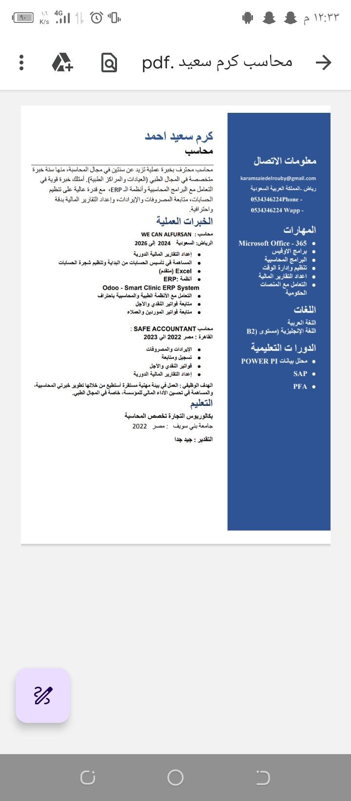 محاسب مصري متواجد في الرياض العمر 26 عام علي دارية كافية بالسوق السعودي وخبرة سنة في المجال الطبي السعودي بداية من تصفية العهد وجرد المستودعات ورفع الرواتب على مدد واعداد ورفع الاقرار الضريبي لكل فترة محاسبيه ومطابقه كشوفات حساب العملاء والموردين ومطابقة البنوك وأرشفة القيود المحاسبية وأجيد استخدام برنامج Smart برنامج ODOO من ERP SYSTEM وبرنامج دفترا المهام متابعة المناديب وخطه لتقليل التكاليف