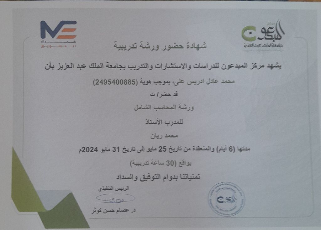 أنا محاسب سوداني الجنسية حاصل على بكالوريوس في المحاسبه أجيد العمل على الحاسب الآلي وحاصل على شهادة من مركز مبدعون في جامعة الملك عبد العزيز