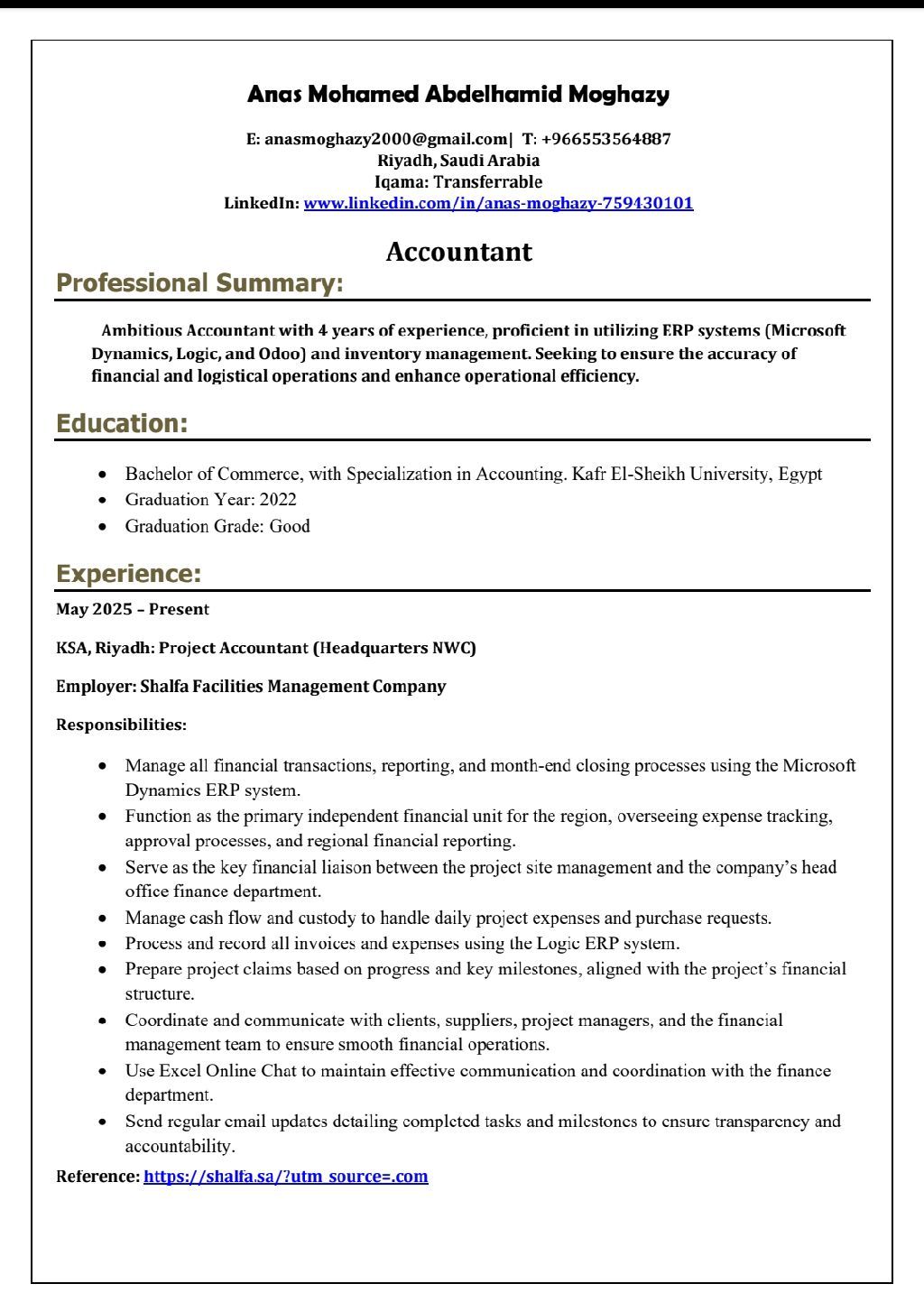 I am an experienced Accountant with over 4 years of practical experience in financial accounting and inventory management, gained through working in different environments in Saudi Arabia and Egypt. I have strong skills in financial data analysis and reporting using Excel and Power BI, and solid experience with ERP systems such as Microsoft Dynamics, Odoo, and Logic