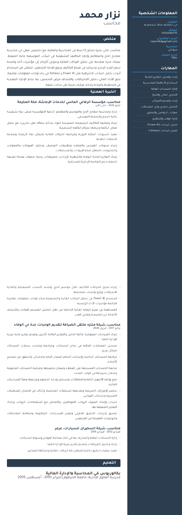 محاسب مالي بخبرة تتجاوز 13 سنة في المحاسبة والمالية، مع تخصص عملي في محاسبة مطابخ الحج والمطاعم وإدارة التكاليف التشغيلية في البيئات الموسمية عالية الضغط. يمتلك قدرة متقدمة على تحليل البيانات المالية وتحويل األرقام الى مؤشرات أداء واضحة تدعم القرار اإلداري وتساعد في ضبط التكاليف ورفع كفاءة التشغيل. متمكن من استخدام أدوات تحليل البيانات الحترافية مثل BI Power وTableau في بناء لوحات معلومات تفاعلية