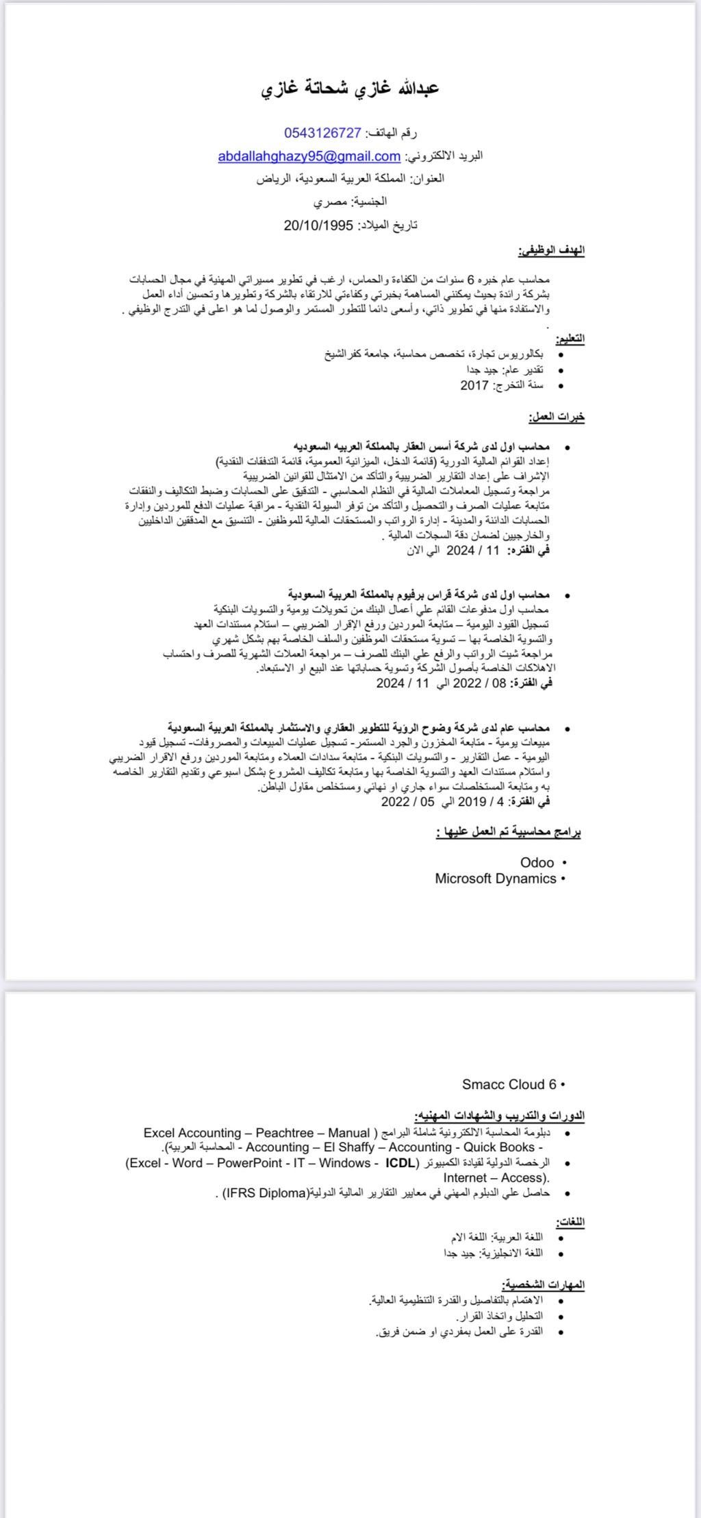 محاسب أول خبرة 7 سنوات داخل السعودية (اعداد القوائم الماليه مراجعة وتسجيل المعاملات الماليه في النظام المحاسبي التدقيق علي الحسابات وضبط التكاليف ومراقبة عمليات الدفع وادارة الحسابات الدائنة والمدينة ادارة الرواتب والمستحقات الماليه للموظفين خبرة ممتاز ببرنامج سماك كلاود 6 وبرنامج أودو المحاسبي والمايكروسوفت دينمك 365) حاصل علي شهادة IFRS المعايير الدوليه للتقارير الماليه ابحث عن فرصة محاسب أول