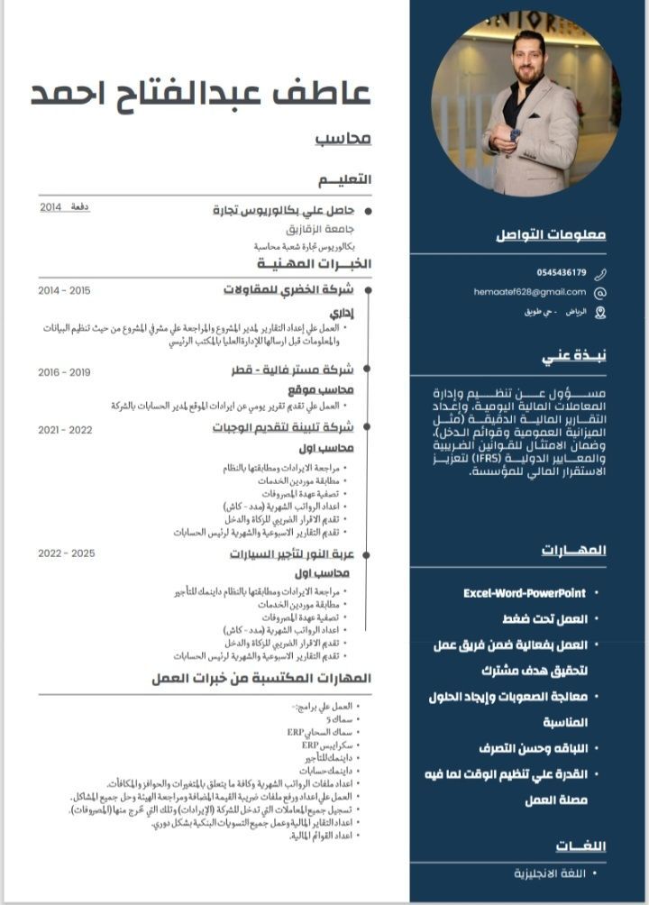 محاسب خبرة أكثر من 6 سنوات في مجالات مثل المقاولات والمطاعم وتأجير السيارات في السعودية ابحث عن عمل لتحقيق هدف مشترك. يوجد إقامة ومتاح نقل كفالة