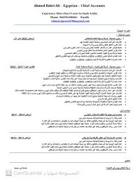 محاسب أول ورئيس حسابات مصري خبرة أكثر من 12 سنة في السعودية في مجال المحاسبة والمالية ابحث عن فرصة عمل مناسبة لما يتوافق مع خبرتي وأبرز الخبرات اعداد ومراجعة القوائم المالية والتقارير الدورية والاشراف على الدورة المحاسبية كاملة واعداد الميزانيات والتخطيط المالي والتعامل مع الزكاة والضريبة (VAT) وادارة الحسابات العامة وحسابات العملاء والموردين وخبرة بالأنظمة المحاسبية والالتزام باللوائح السعودية