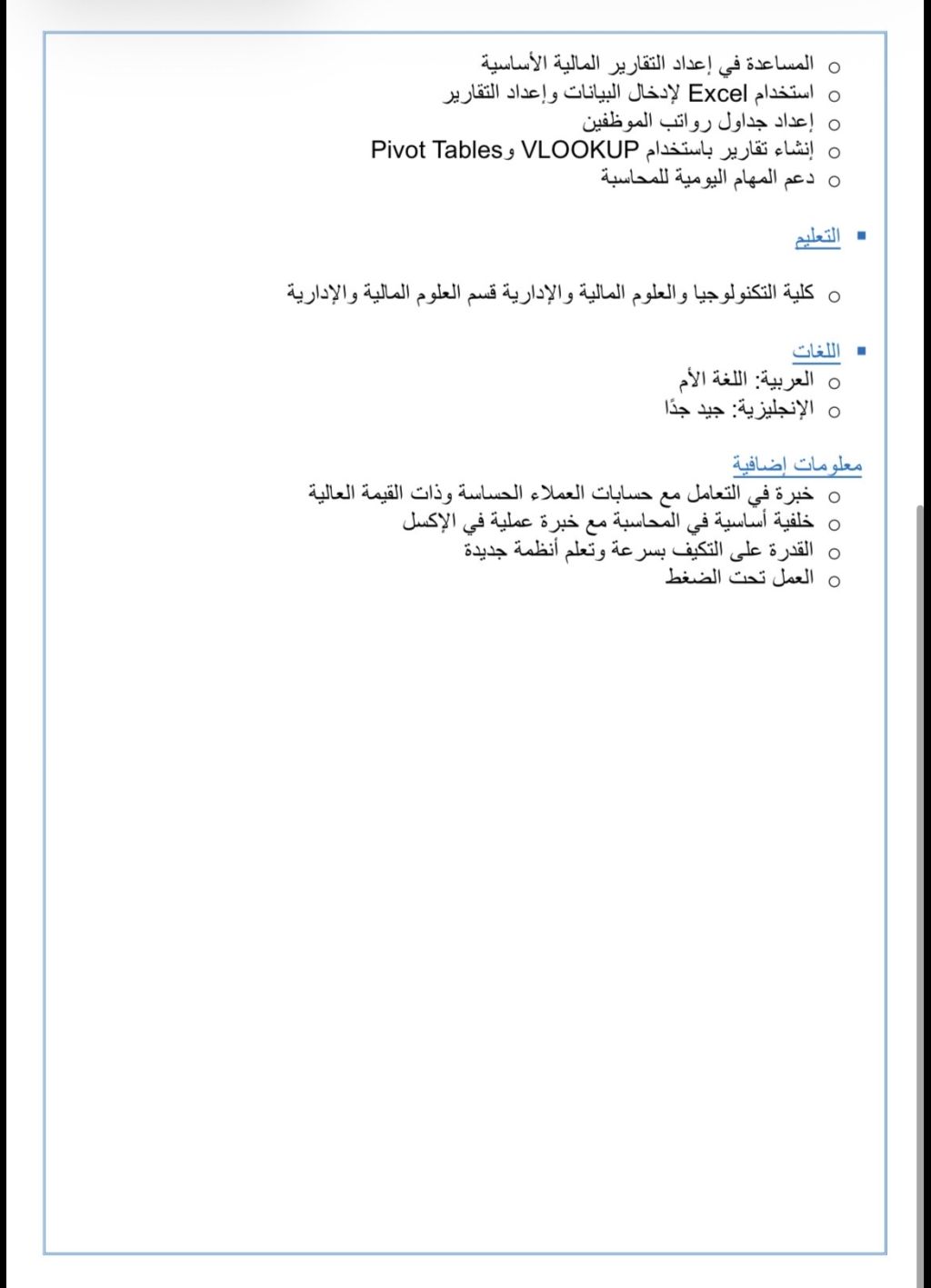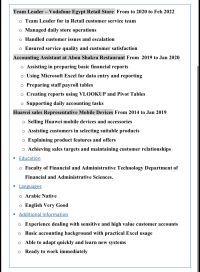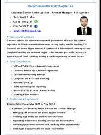 محترف بخبرة أكثر من 5 سنوات في خدمة العملاء بشركة اتصالات الامارات الكبري خبرة قوية في التعامل مع العملا VIP ادارة الشكاوى وادارة الحسابات وحالات التصعيد خبرة في العمل ك supervisor / team leader متابعه أداء الفريق تحقيق التارجت الالتزام ب SLA, KPI بالاضافة الى اجادة قوية لبرنامج Microsoft excel في التقارير والأعمال اليوميه