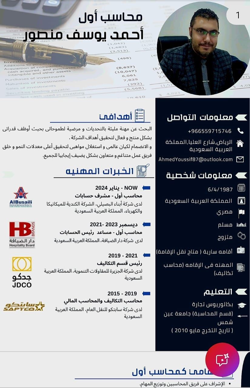 دوام جزئي محاسب أول تكاليف متواجد في الرياض يبحث عن دوام جزئي خبرة أكثر من 10 سنوات في الحسابات الماليه عامة وحسابات التكاليف خاصه والرقابة علي المصروفات في شركات مقاولات ولأنشطة الصناعية والتجاريه والمطاعم والكافيهات بداية من انشاء دليل الحسابات حتى اعداد القوائم الماليه مع المراجع القانوني وتسجيل العمليات اليوميه ومقارنتها بالموازنة واعداد موازين المراجعة الشهريه ورفع الضريبة وعمل التسويات